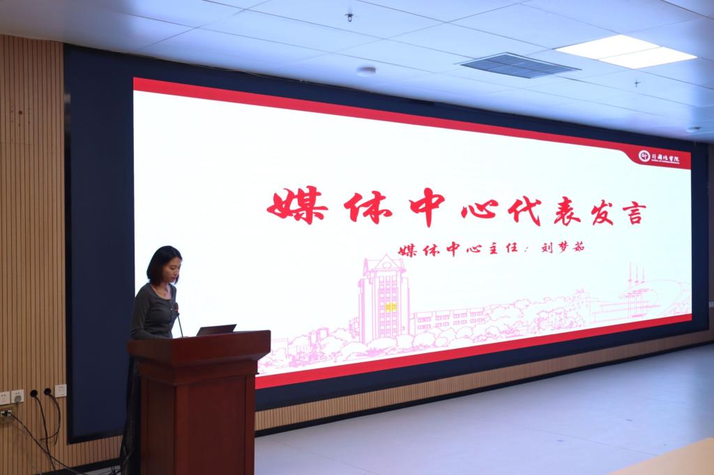 胡帅老师在发言中表示,希望新同学们通过本次活动能对学院团学组织有进一步的了解,并能结合自身实际选择适合自己的部门,丰富大学课余生活,在实践中锻炼自我,在团学工作中增长才干,在热爱中收获成长。 媒体中心在大家的热烈欢迎中率先登场,运营部、编辑部、技术部和记者团各自展示了自己的部门职责和特色,表达了对新同学加入的期待。 (学生)团委和学生会采用“团学一体”方式进行宣讲,两个学生组织的对口交流部门两两成对进行了精彩的宣讲。各部门采用丰富多样又生动有趣的形式进行部门介绍和讲解,赢得了在场同学们的阵阵掌声。