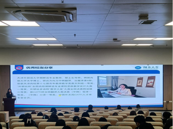 会后,高晓婷校友为朝鲜语系在校生作了一场报告。报告主要围绕“如何提升专业素养”“职业规划与就业指导”以及“中韩研究生对比分析”三个方面进行。首先,高晓婷根据自身积累的学习经验,谈到语言学是回报率很高的学科,只要肯下功夫,勤学苦练,就能实现较好的效果。她强调,理论学习之余,绝不能忽视实践能力的培养。平时要注重加强精听精练,选择韩语新闻或专项音频,有针对性地提高听力水平;也可借助人工智能软件,如 AI 对话等,掌握地道的韩语发音与表达方式。