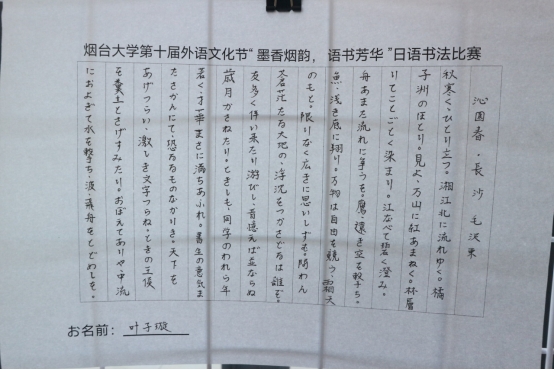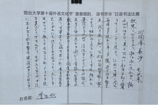 学生们在书法作品中表达出了对本国文化的热爱、对异国文化的尊重,展现出了极高的艺术素养,深刻彰显出对日语书法独特魅力的深刻领悟。墨舞金秋,笔韵传情,每一滴墨香都承载了学生对烟大建校四十周年的深切祝福、对传统文化的深情致敬。同学们以笔墨为媒,以语言为桥,书写了烟大一路走来的光辉历程,展现出了新时代烟大青年的风采与魅力。此次大赛的成功举办不仅充分展现出学生积极向上的精神风貌和勇于挑战自我、展示自我的青春活力,同时进一步巩固了中日文化友好交流的基石,促进了文化互鉴与交流。
