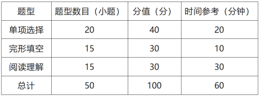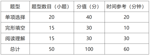 满分为100分,时间为60分钟,共3种题型50道题,全部为客观题。参赛选手不得使用任何纸质词典、电子词典和工具书。