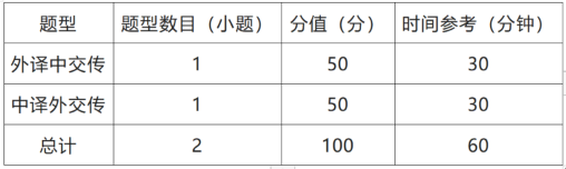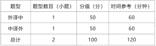 满分为100分,时间为120分钟,共2种题型2道题,全部为主观题。参赛选手可使用中译外、外译中纸质版词典各1本。
