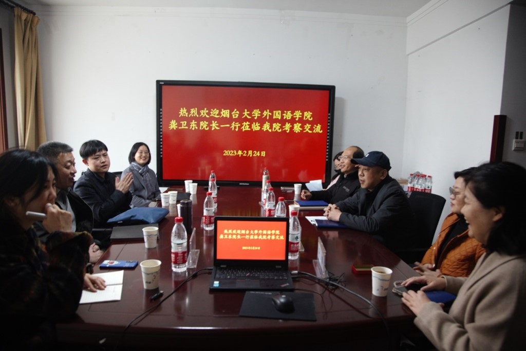 2月24日,成人tv 院长龚卫东等一行四人,就英语一流专业建设和商务英语专业论证,赴山东财经大学成人tv 交流访问。于秀金院长介绍了学院近年来在国家一流专业建设、一流课程建设、学科建设等方面所做的努力及成效。商务英语系主任阮岳湘重点讲解了商务英语专业建设中人才培养模式、课程体系构建、学生实践实习等具体事宜。