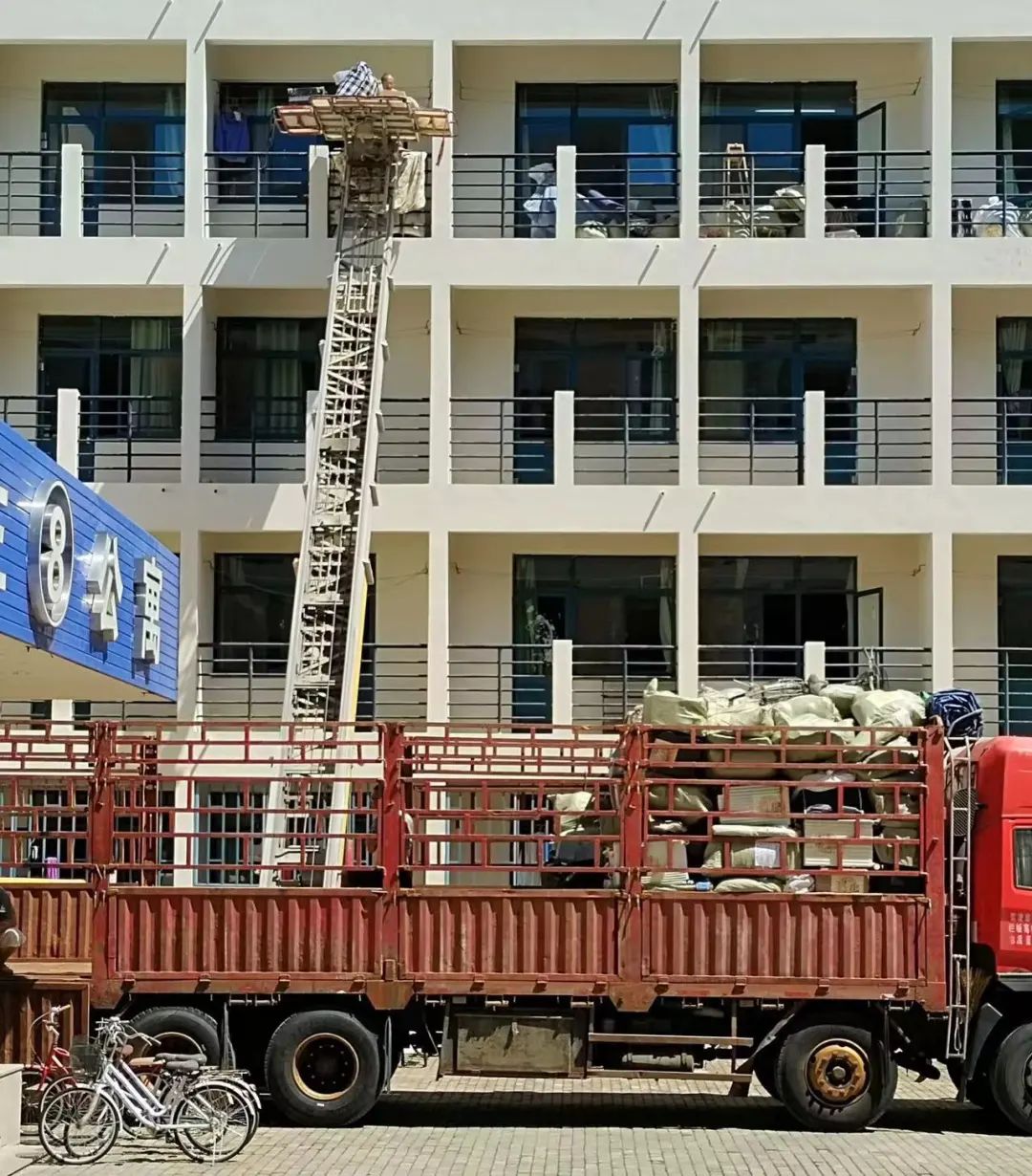 随后,工作人员通过云梯将行李有序运往货车,待货车装满,便即刻前往新校区。GOOD TIME