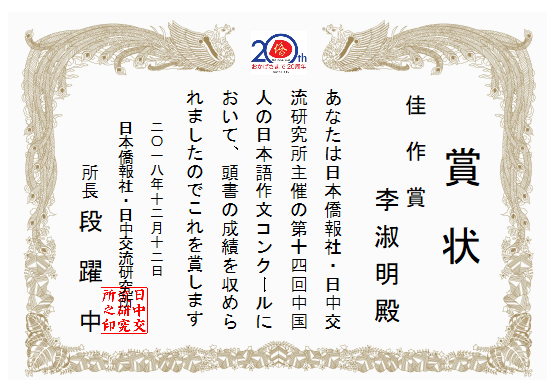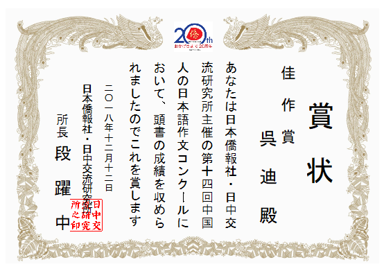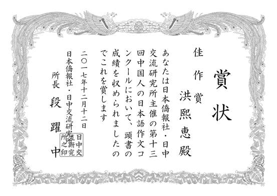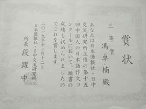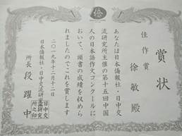 《全中国日语作文大赛》是由日本侨报社和日中交流研究所主办的目前国内规模最大的日语作文大赛。每年都有200多所高校学生参加比赛,参赛作文达到4000多篇。由日方评审员选出获奖作品,并在每年12月12日在驻华日本大使馆举办颁奖典礼及获奖者演讲大赛,邀请最优秀奖获得者拜访日本一周。每年三等奖及以上作品编辑成书在日本出版发行,上架各大书店。我校从2015年参加此大赛以来保持每年均获得奖项,累计获得三等奖3人,佳作奖6人。